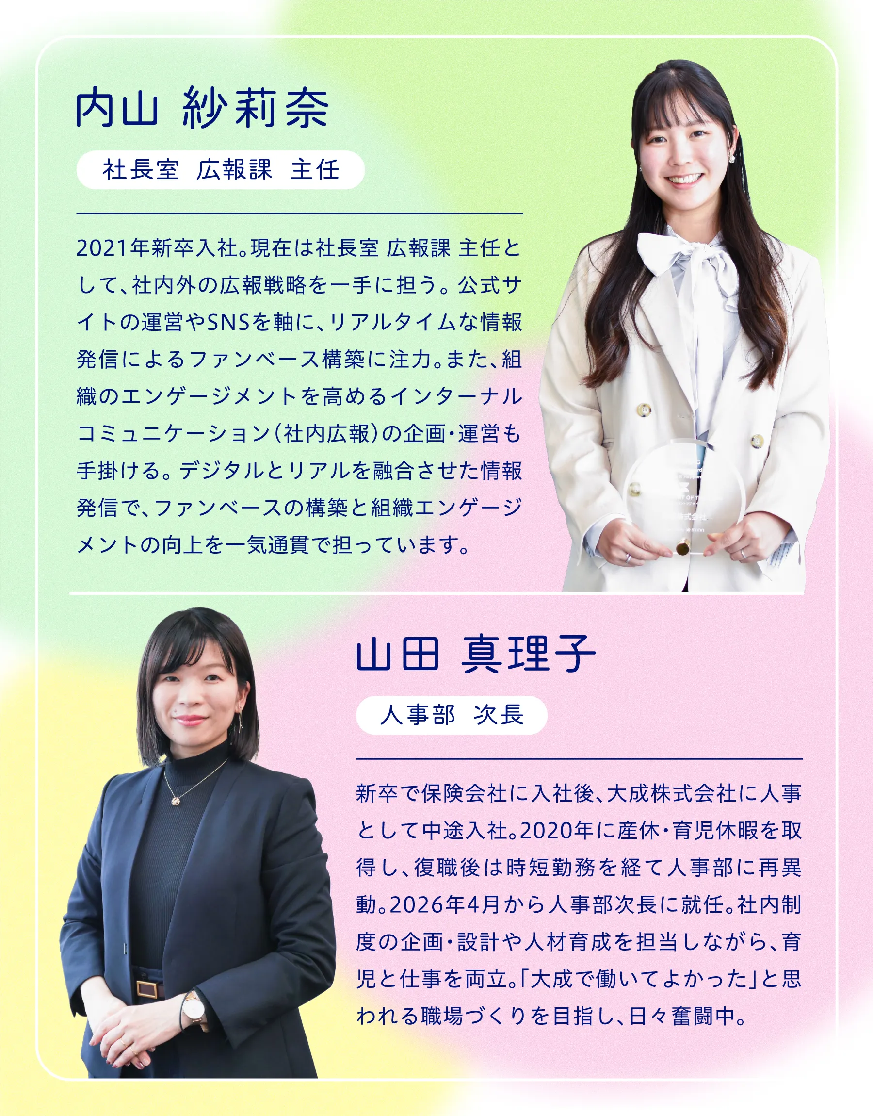 改めて、具体的な成果や取り組み内容、大成が目指す理想の組織の姿について、プロジェクトメンバーの2名に話を伺いました。
